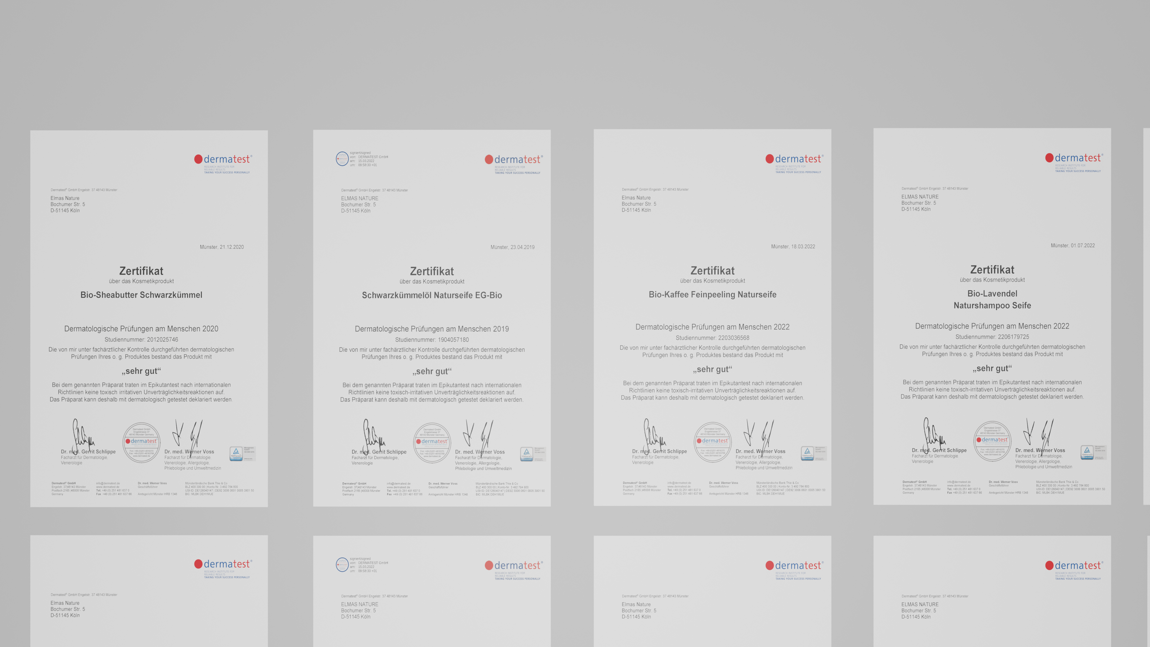 All unsere Seifen werden bei dermatest analysiert und bewertet hinsichtlich dem Kontakt zwischen der Haut und unserer Seife. Alle Ergebnisse sind transparent für dich sichtbar und ebenso ein Qualitätsnachweis.